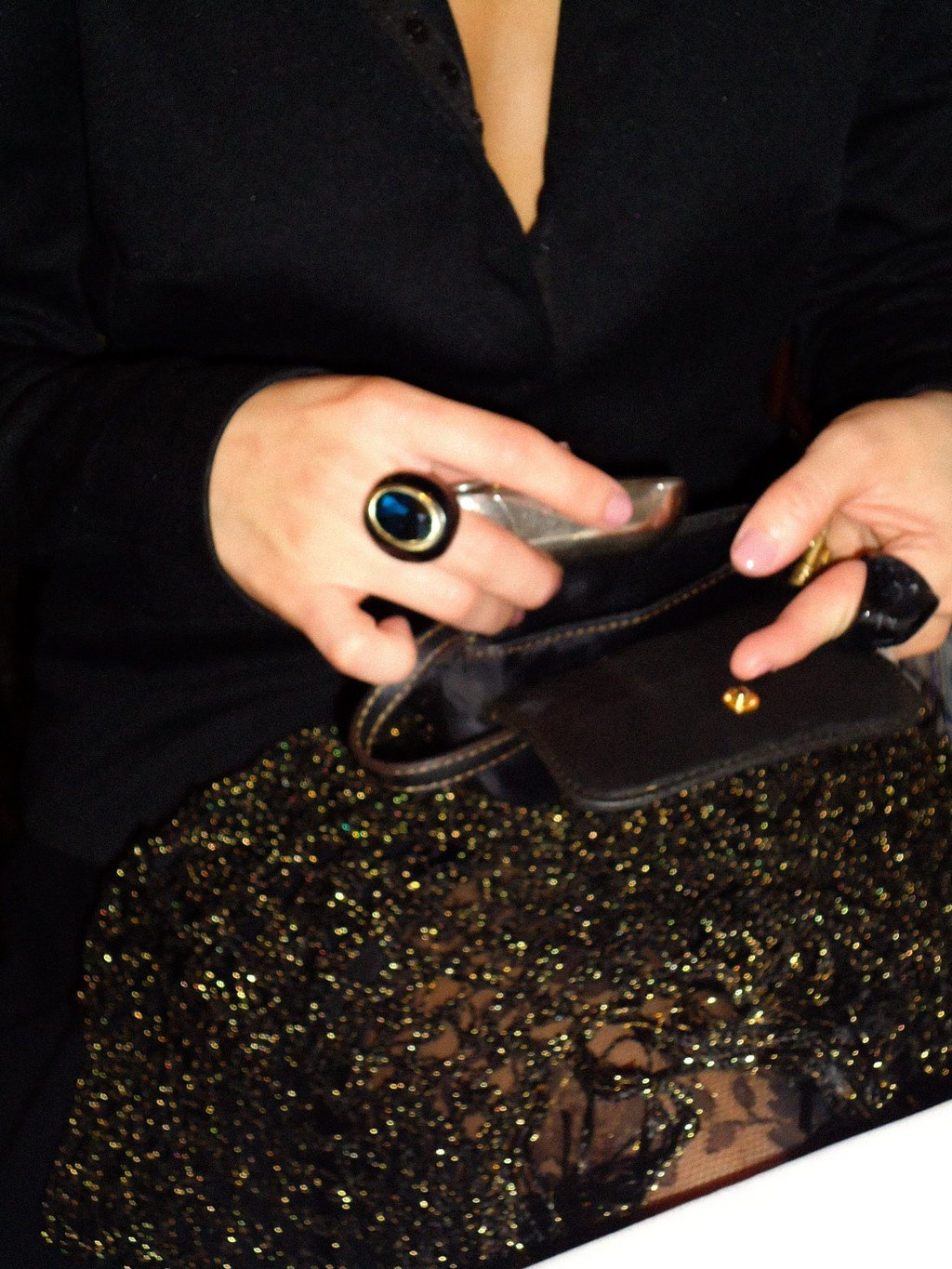 Anel vintage max pedra preta, revestido por pedra central azul, acabamentos em dourado envelhecido.