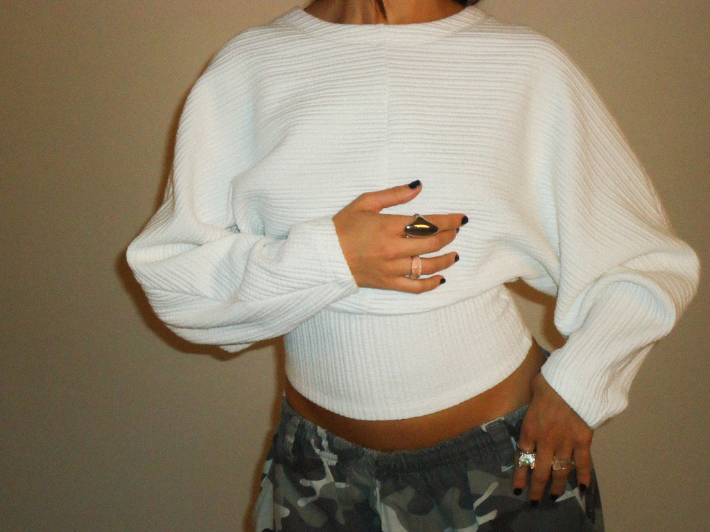 Blusa branca com tecido texturizado em linhas, manga morcego, acinturada e gola careca.