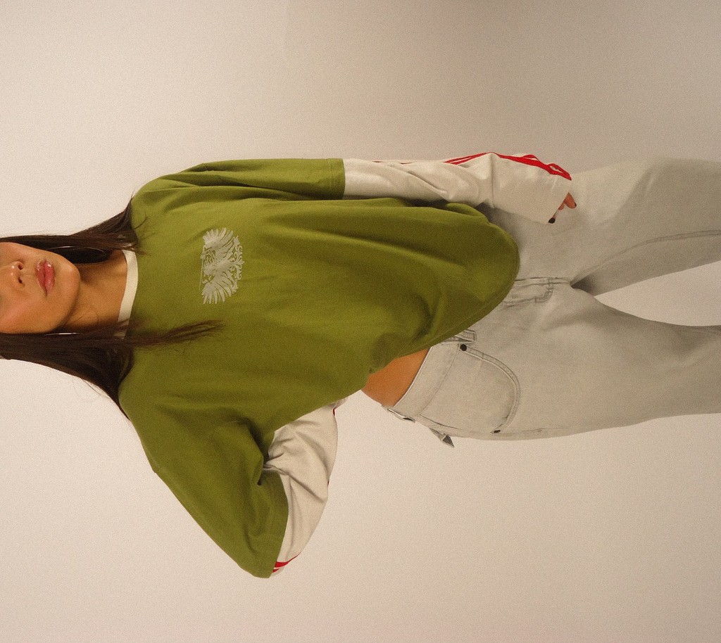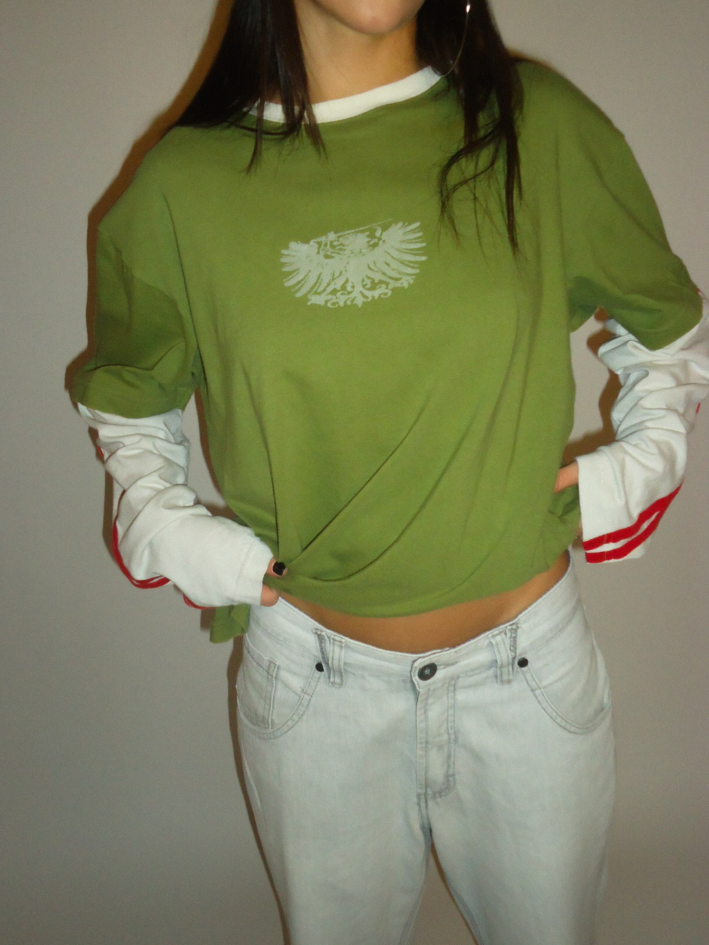 Blusa anos 2000, silk-screen frente e costas. Cor verde e manga recorte branco e listras vermelhas com gola redonda.