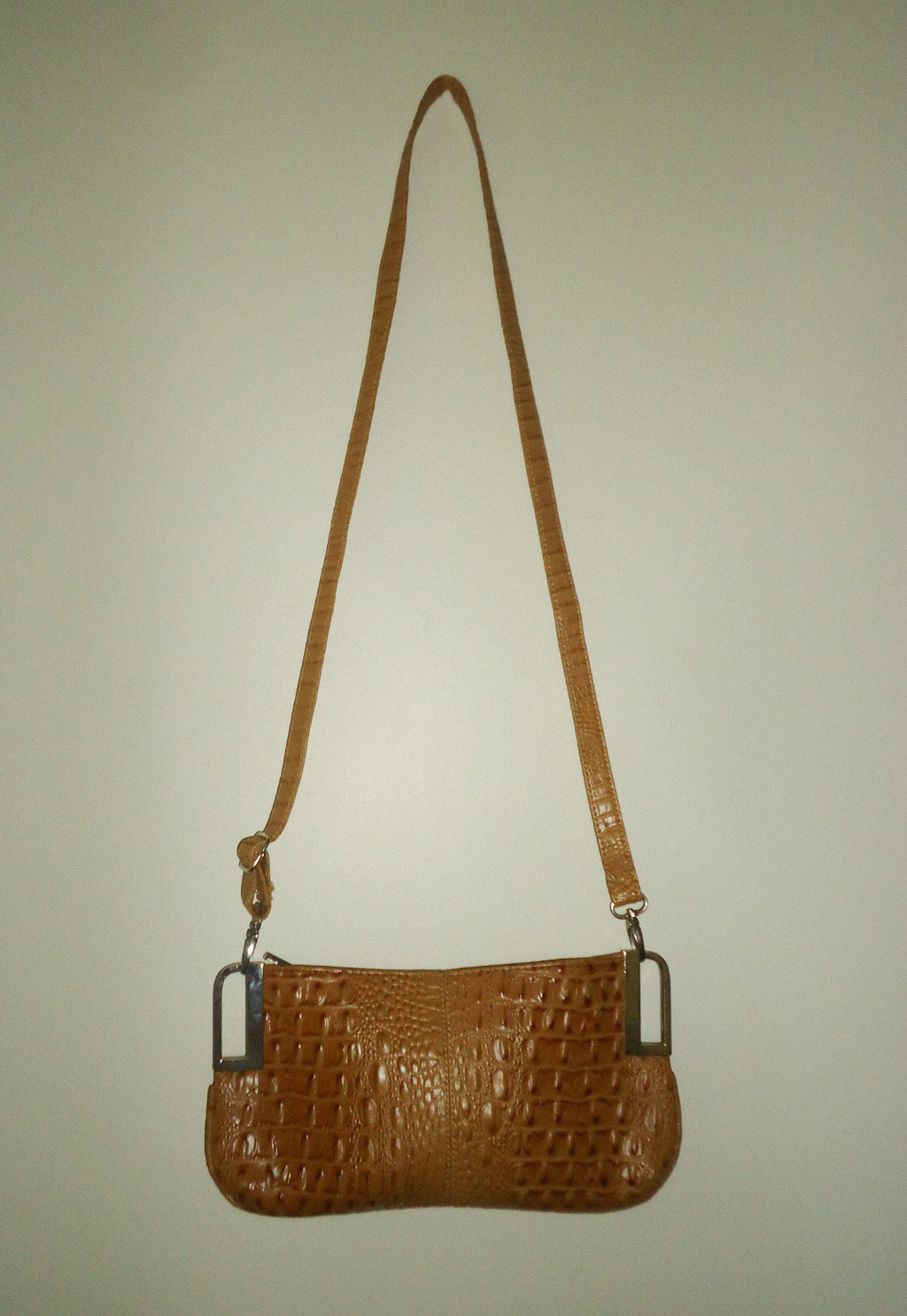 Bolsa courino croco caramelo, detalhes laterais em ferro prata podendo ser usada: no ombro, alça regulável transversal e removivél clutch. Possui zíper, bolso e forro interno.