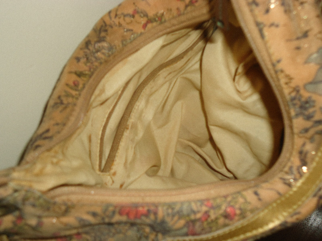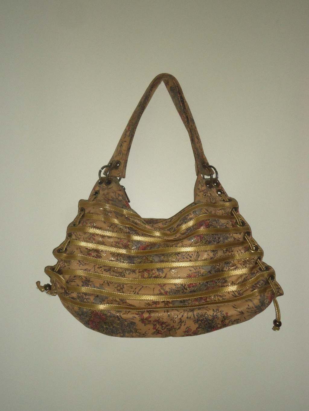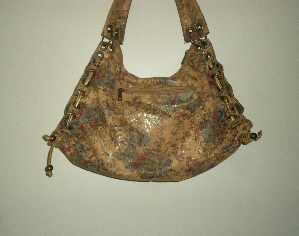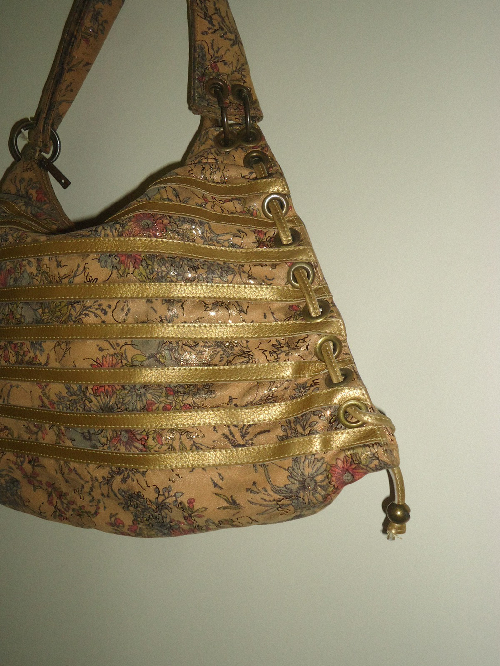 Bolsa vintage nobuck com estampa floral acabamentos em courino dourado, ferragens em argolas, alça larga. Possui zíper, bolso interno e forro.