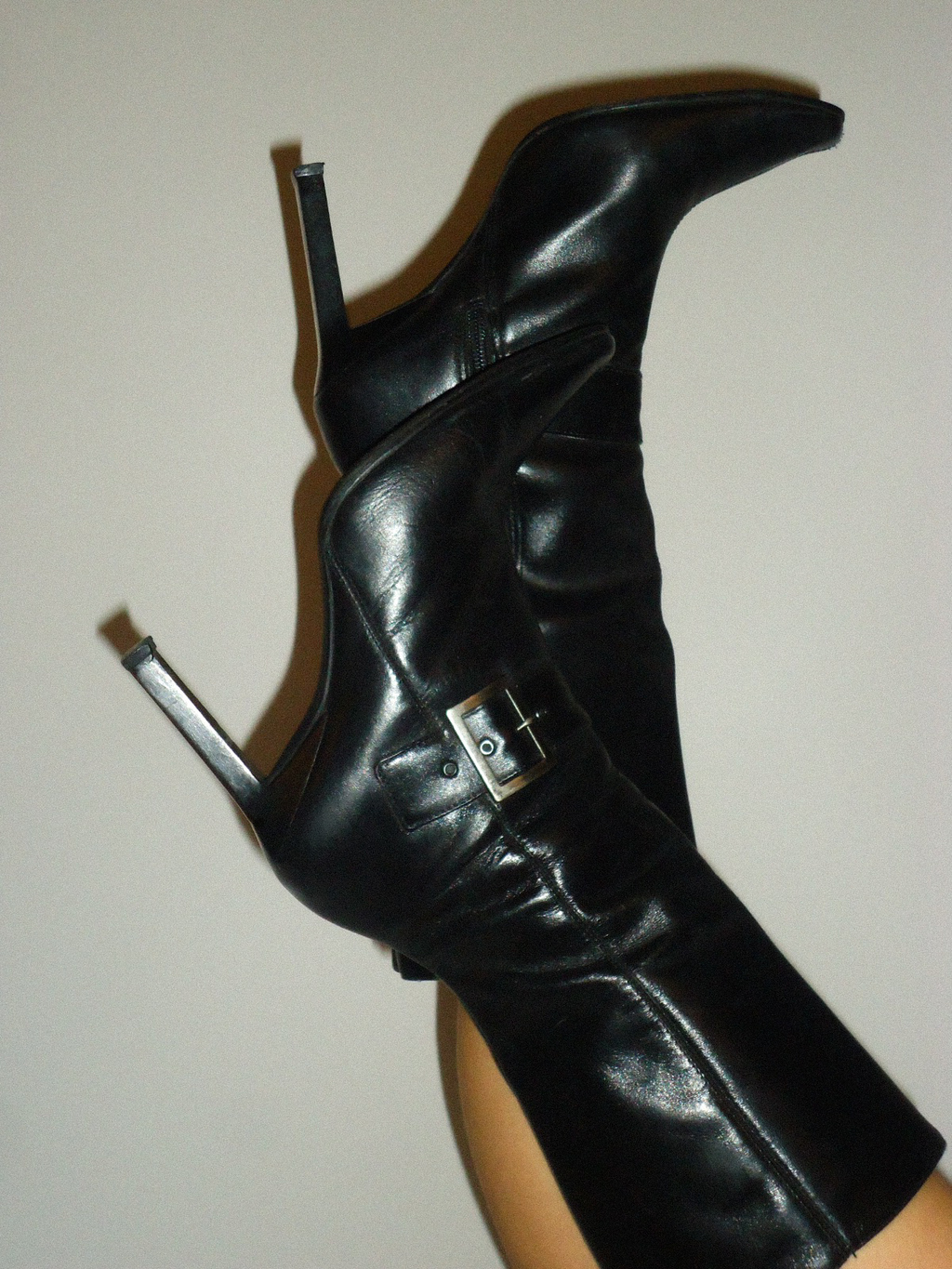 Bota preta em couro, bico quadrado e fivela lateral prata. Parte interna estofada e salto antiderrapante.