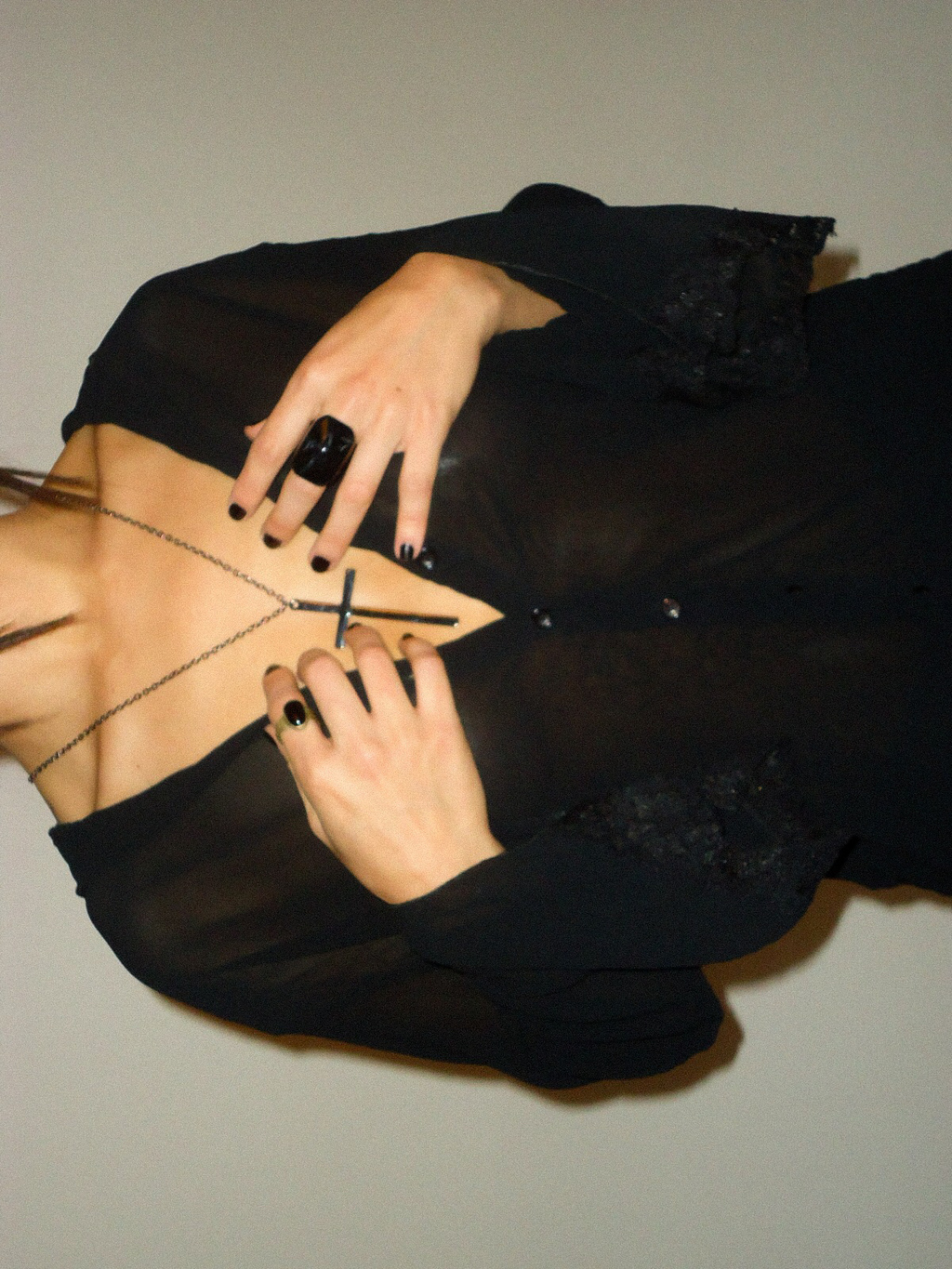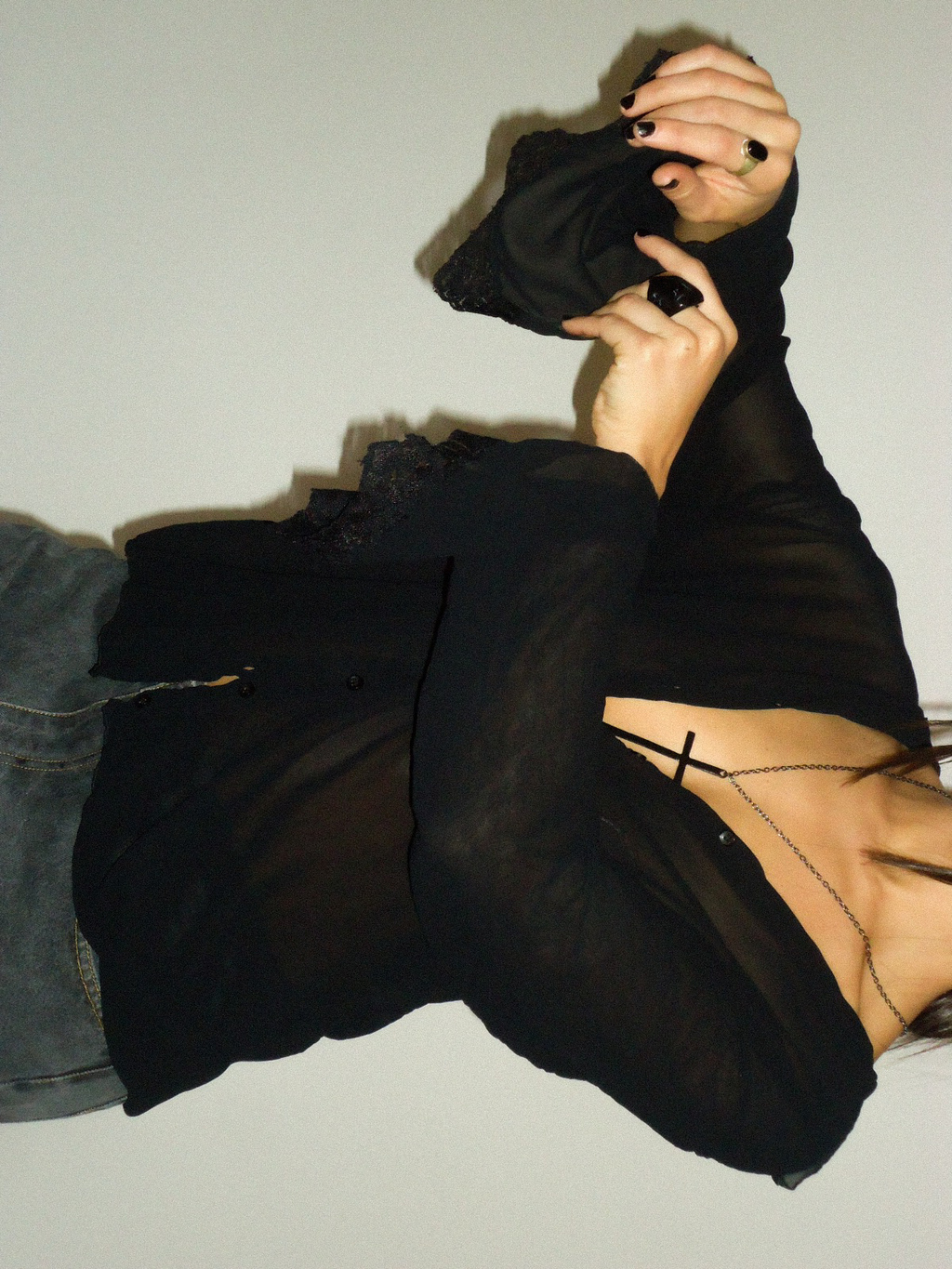 Camisa preta com transparência , gola lapela e aboatoamento frontal e decote v. Manga com leve fenda no punho e acabamento em renda.