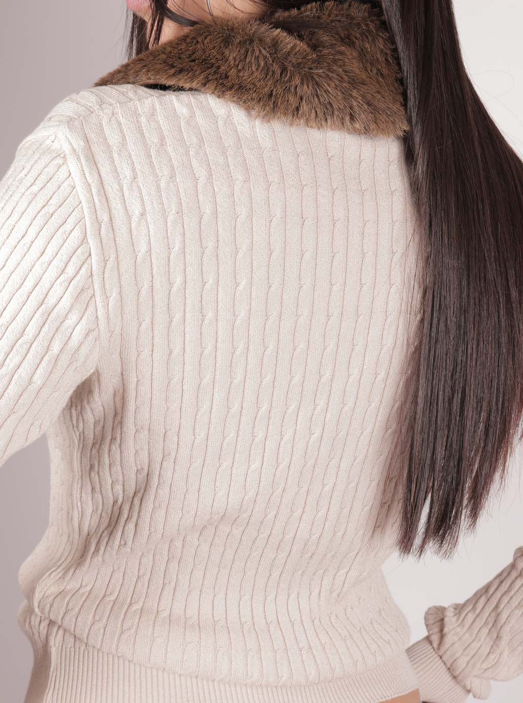 Casaco de tricô manga longa decote V gola deslocada pelo