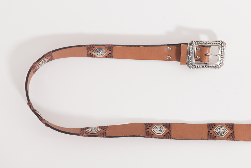 Cinto de couro fivela retangular média detalhes bordado em linhas e ferragens prata.