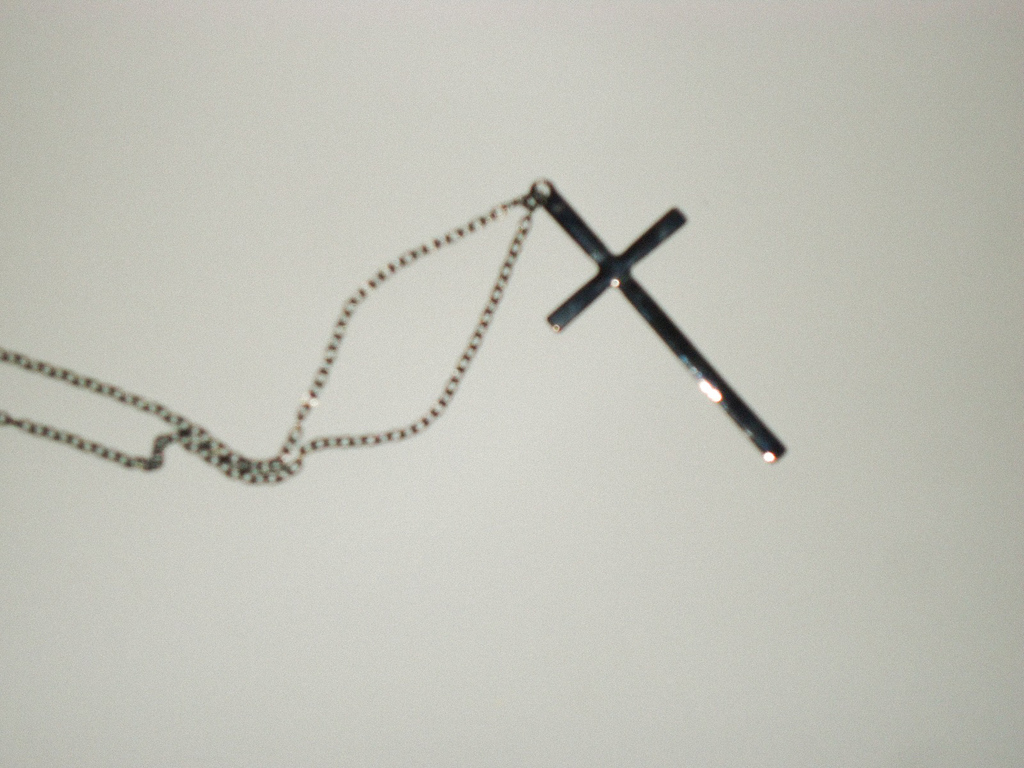Crucifixo grande com corrente ajustável, podendo ser usado como choker ou corrente longa.