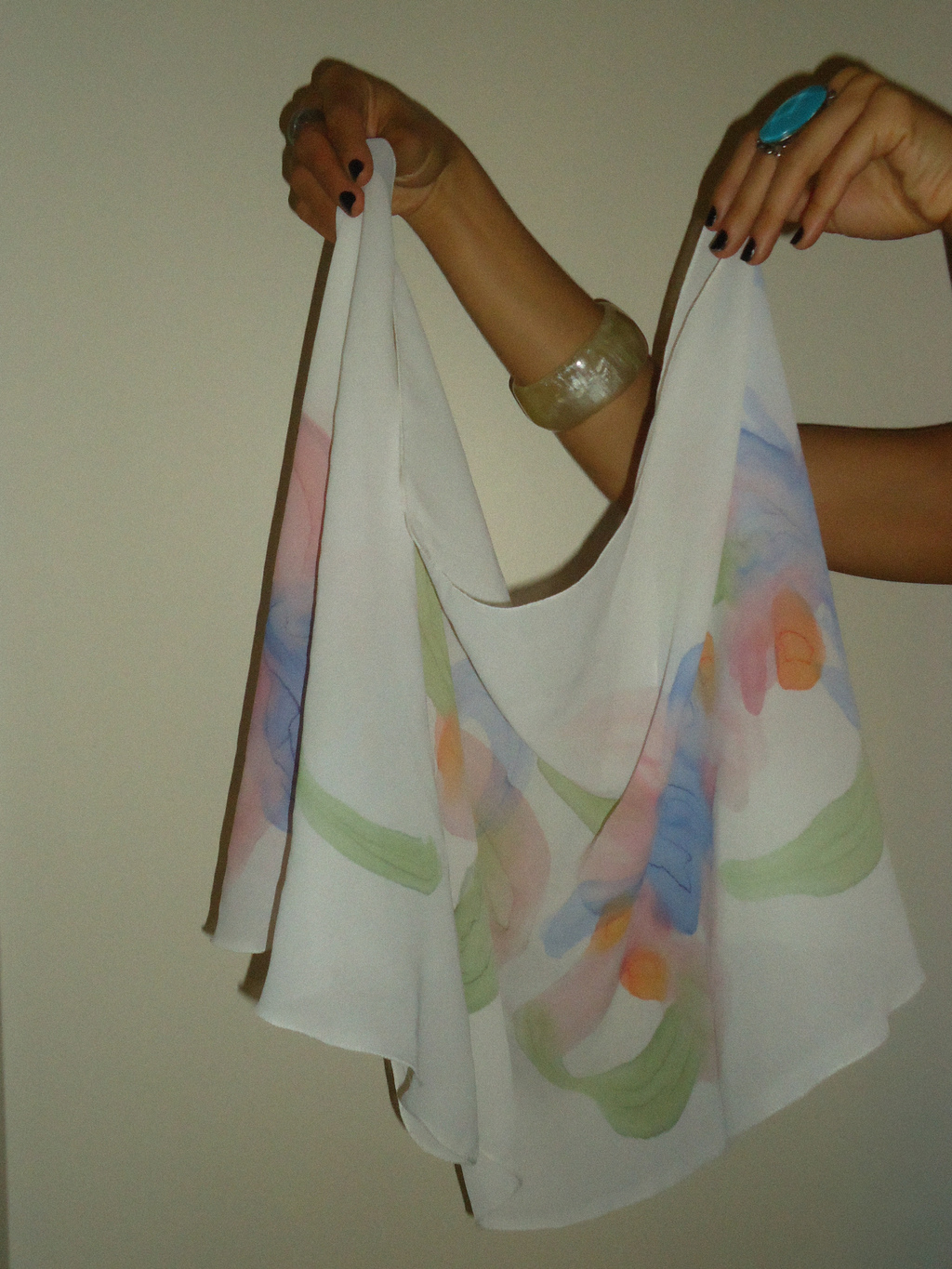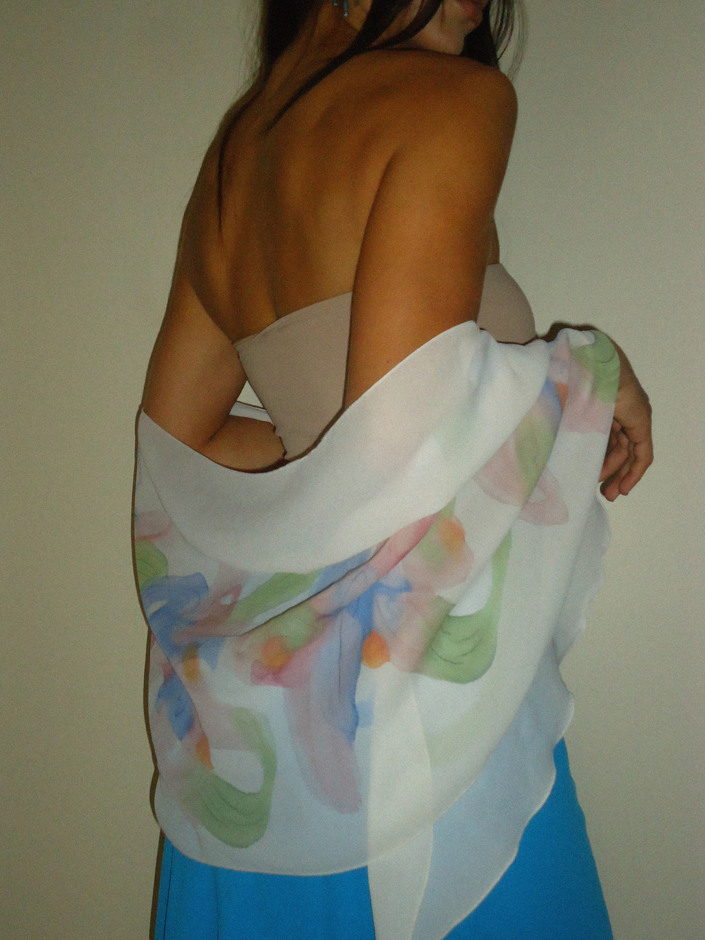 Lenço branco com estampa floral em aquarela, toque em seda. Corte com leve arredondado nas pontas assimétricas.