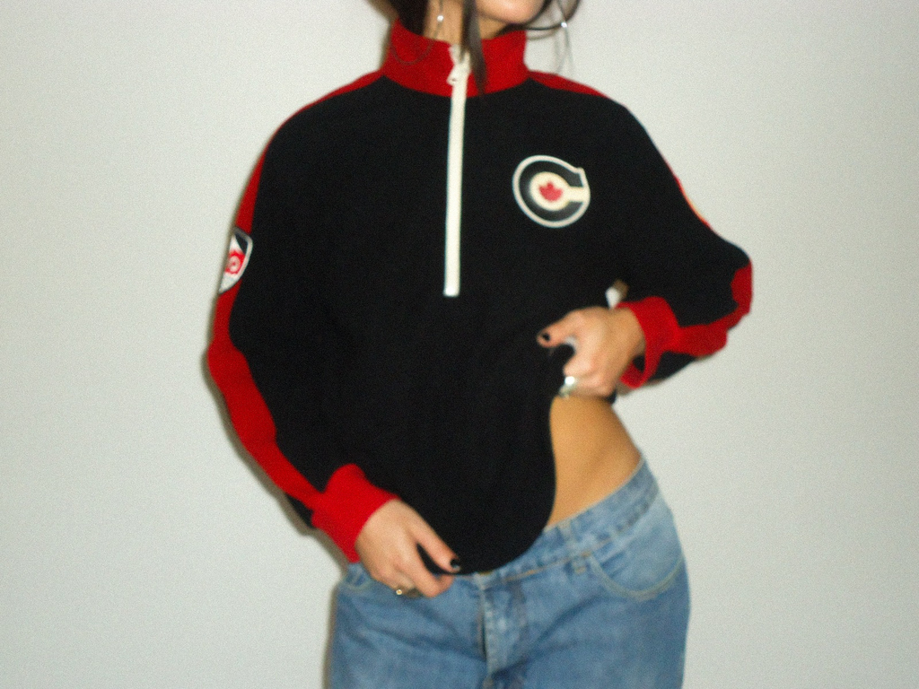 Pullover relíquia Canadá Jogos Olimpicos de 2010 produto oficial. Tecido cotelê preto e acabamentos em vermelho, gola polo e zíper frontal.